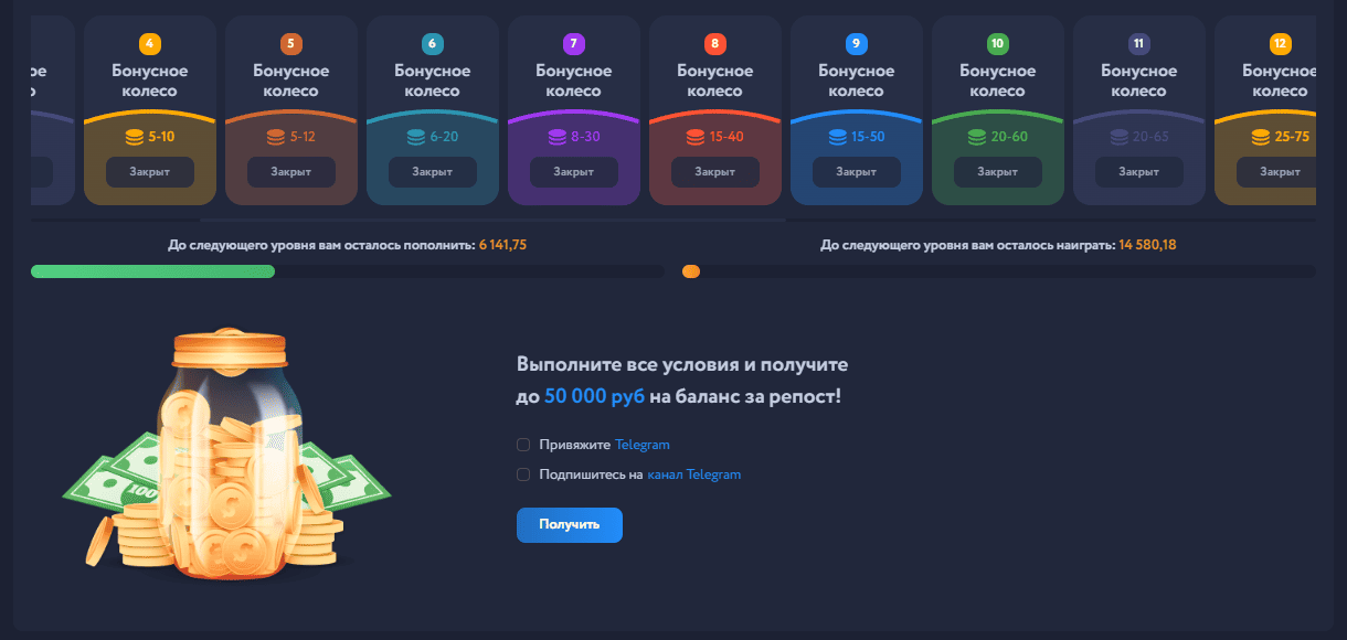 - Ежедневный бонус. Привязав свой Telegram к сайту, пользователи могут вращать ежедневное колесо бонусов. Сумма бонуса зависит от уровня пользователя, который повышается в зависимости от суммы пополнений и сыгранных игр.